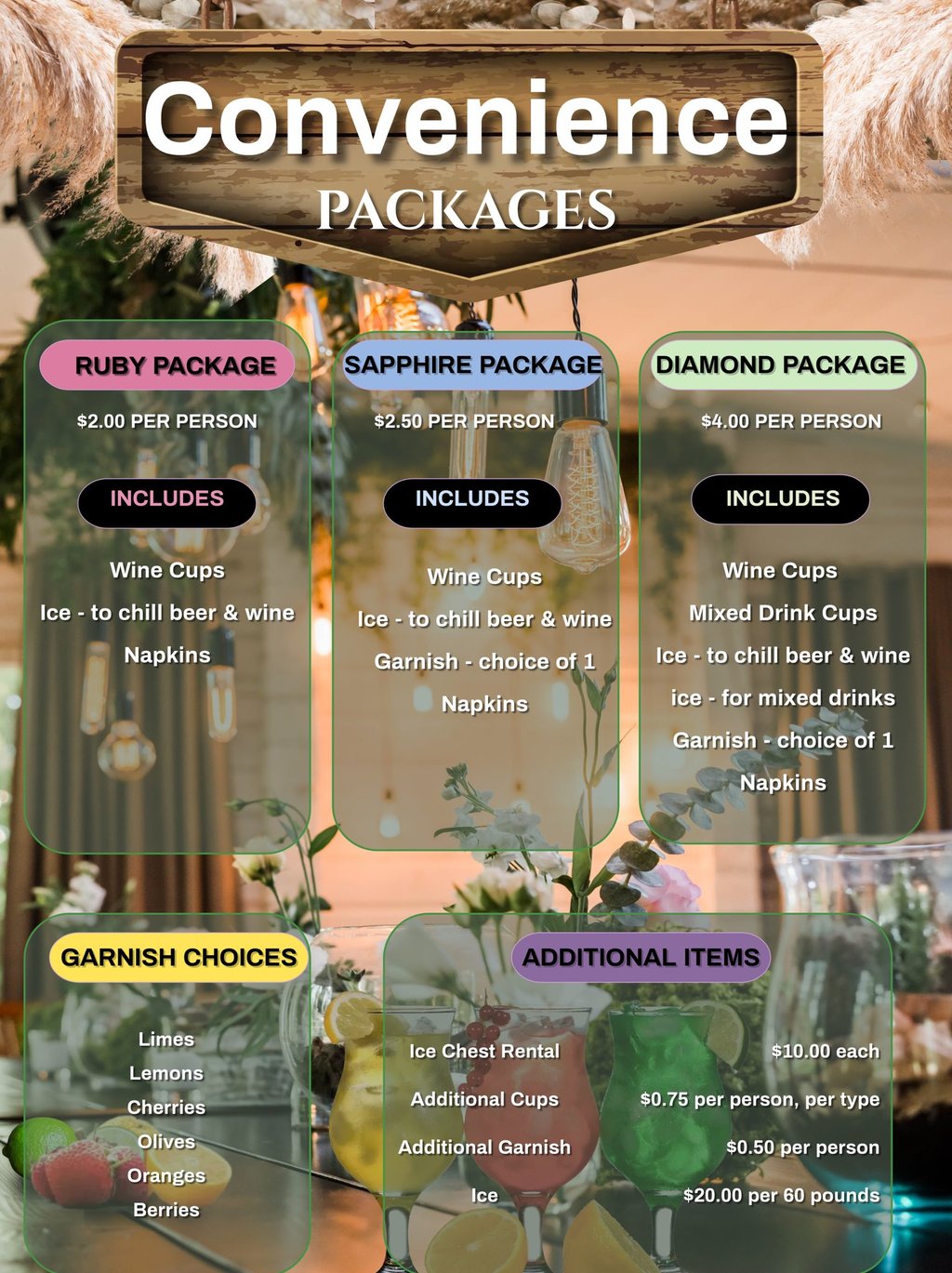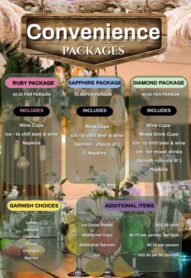 All convenience packages and additions have a maximum serving time of 4 hours. Any time beyond that will be charged at the 'additional items' cost.