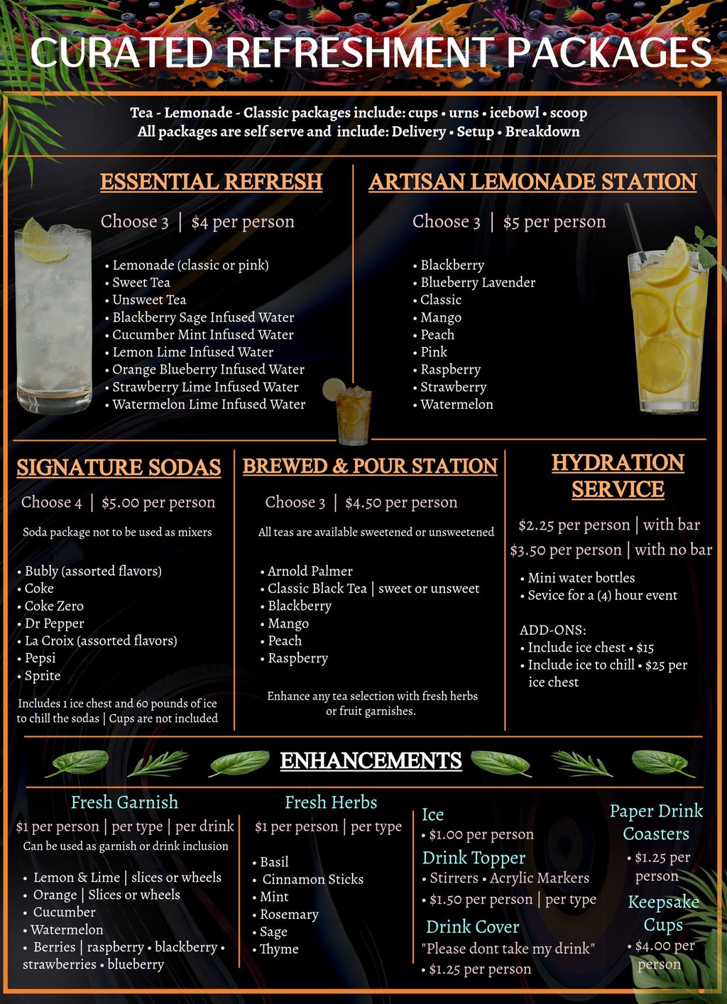 All non-alcoholic beverage services are self-serve and include professional sourcing, delivery, setup, and pickup. Guest count minimums apply. Pricing reflects a thoughtfully prepared experience designed to serve your guests with ease and style.