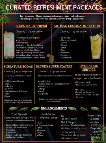 Our non-alcoholic drink packages are designed to stand beautifully on their own or pair seamlessly with bar service. Each option is thoughtfully prepared, professionally presented, and priced to reflect both quality and care—allowing you to choose the level of experience that best fits your event.