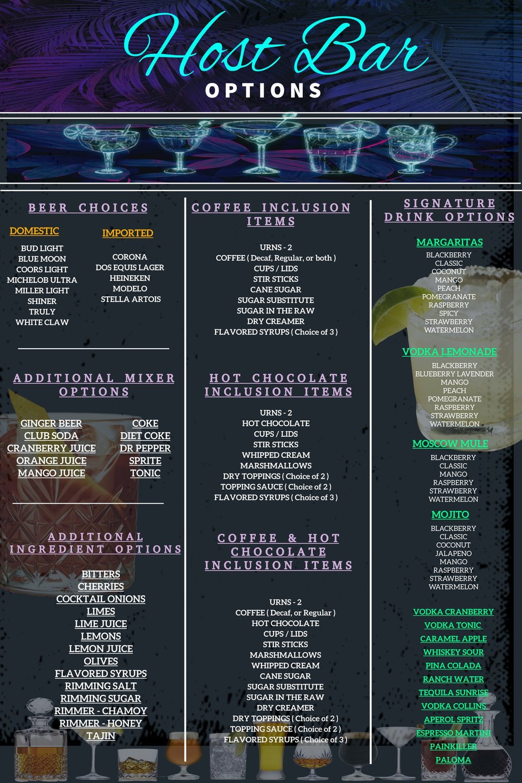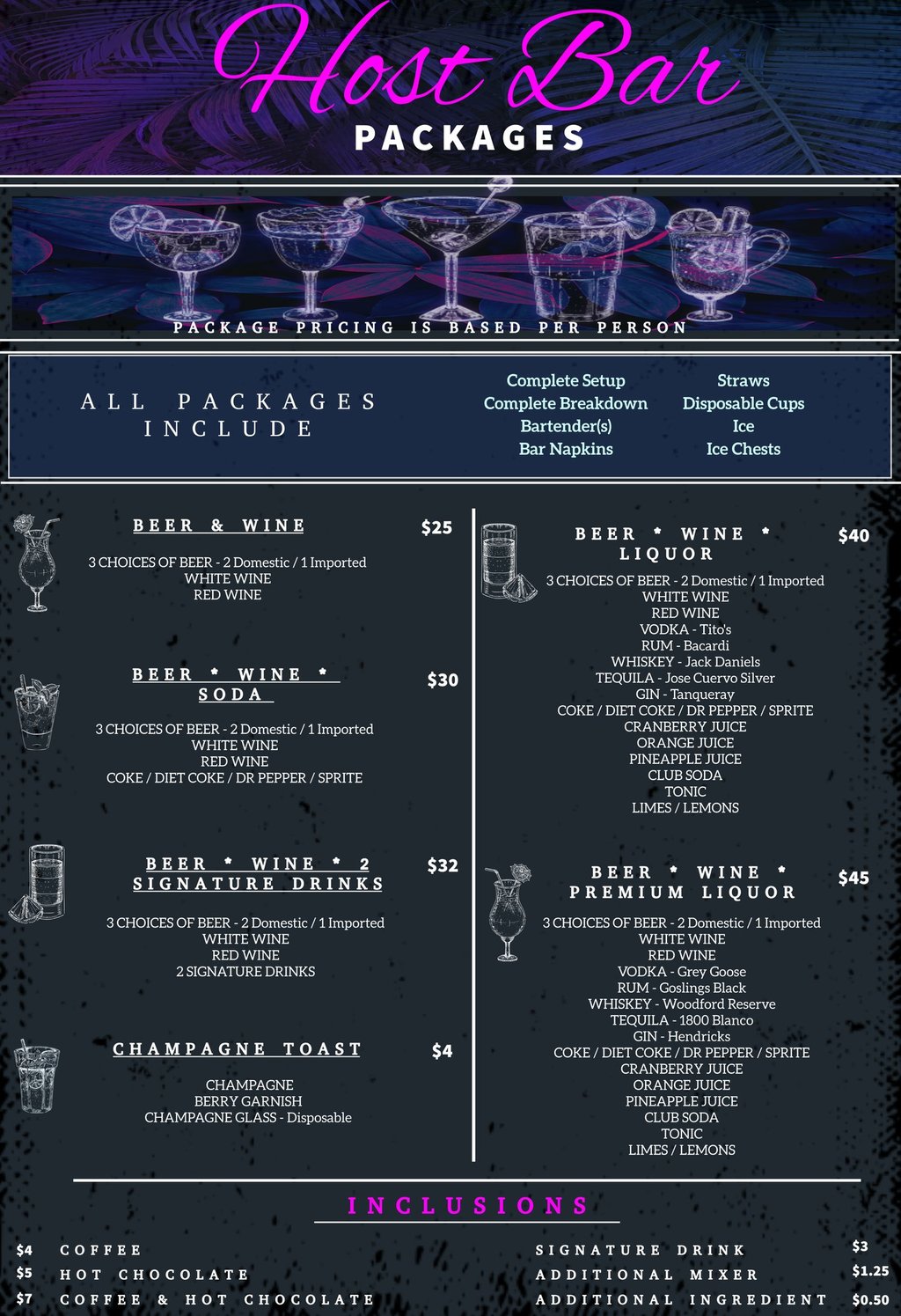 Inclusion signature drinks pricing does not include additional cups, only the signature drink materials. Additional cups will cost $0.25 per person, per additional signature drink.