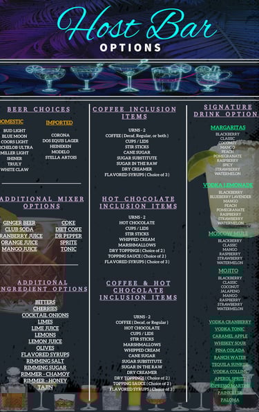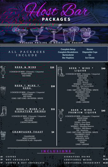 All host bar packages and additions are based on a 4-hour max serving time. Additional time beyond the 4 hours can be purchased for