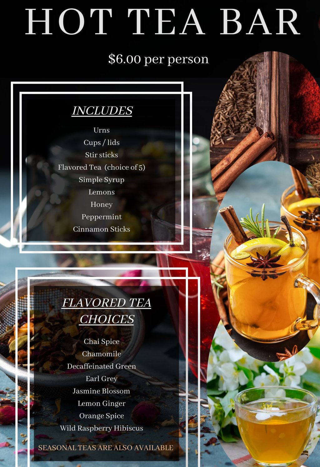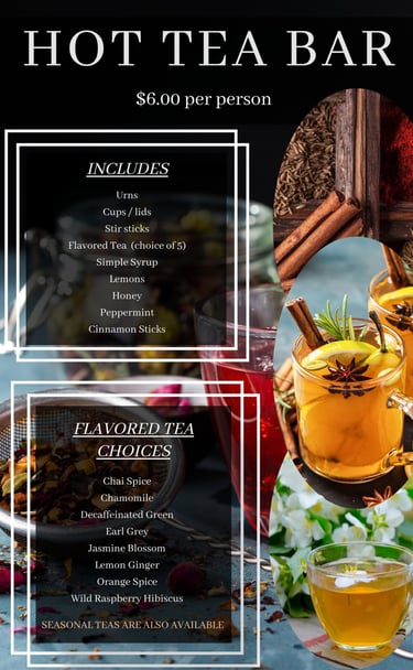 This package is based on a 4-hour max serving time. Additional time beyond the 4 hours can be purchased for $1.25 per person, per extra hour.
