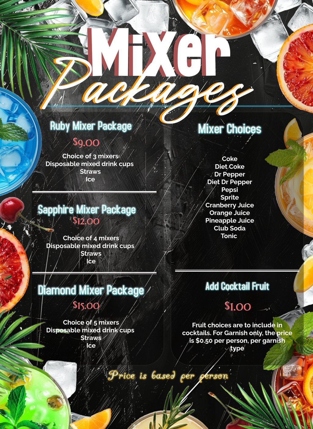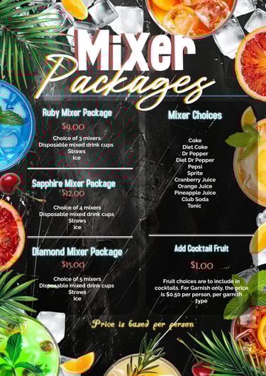 All mixer packages and additions are based on a 4-hour max serving time. Additional time beyond the 4 hours can be purchased for