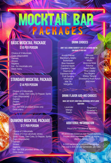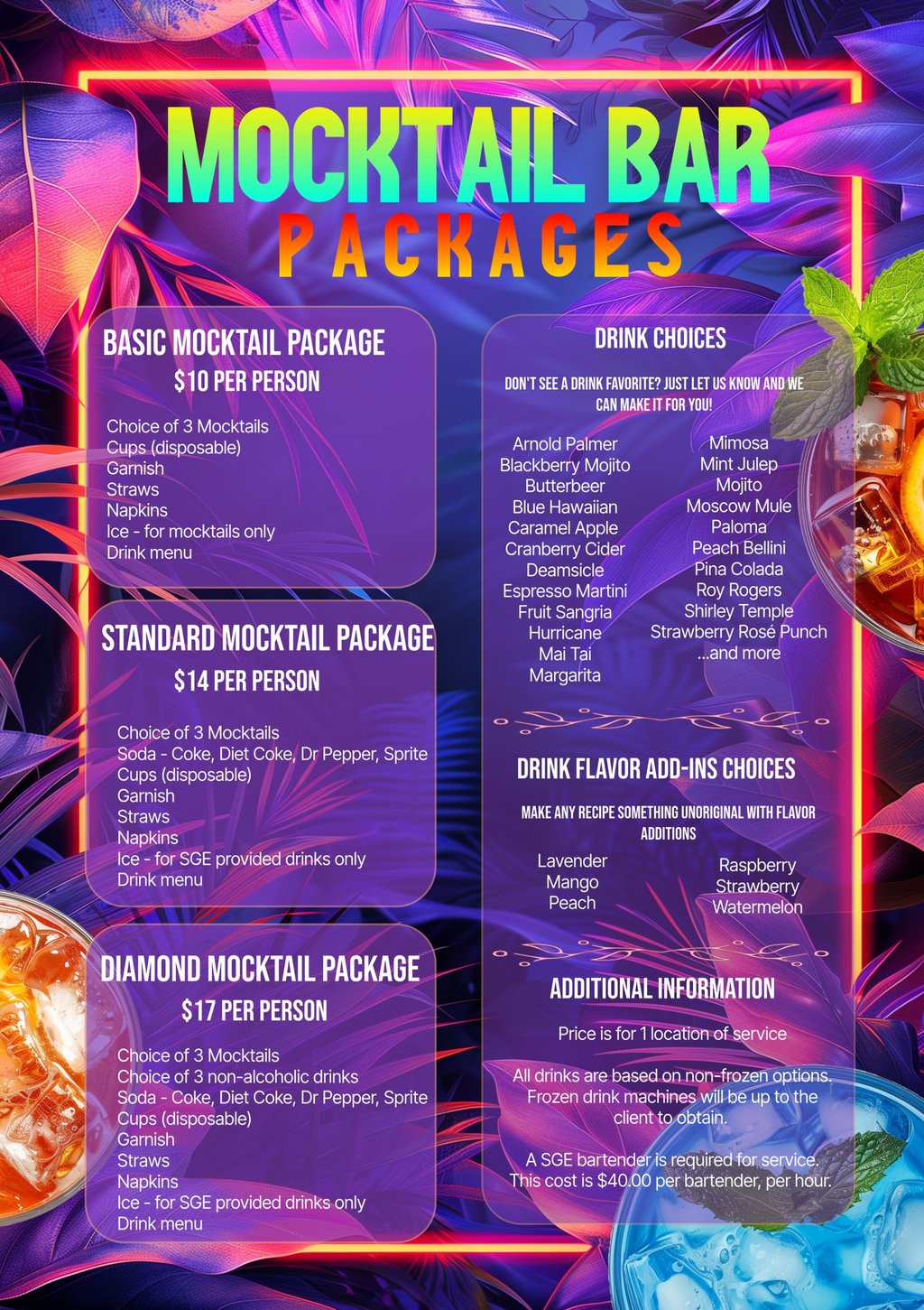All mocktail packages and additions are based on a 4-hour max serving time. Additional time beyond the 4 hours can be purchased for